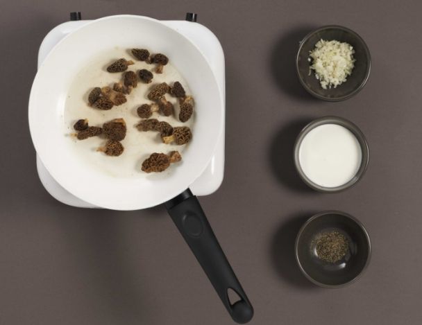 Laver plusieurs fois les morilles à l’eau tiède en 3 bains puis bien les égoutter. Les faire étuver et bien prendre le temps de les faire cuire. Rajouter des échalotes puis la crème et bien poivrer. Laisser cuire les morilles.