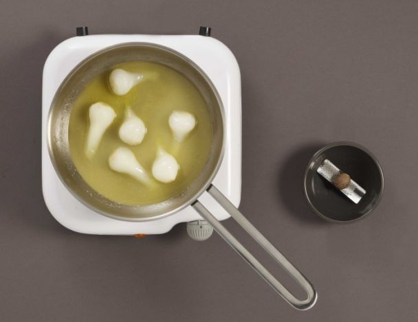 Faire confire doucement les oignons petit fane fondant et assaisonner avec une râper de muscade. Rajouter les oignons fanes confits aux févettes.