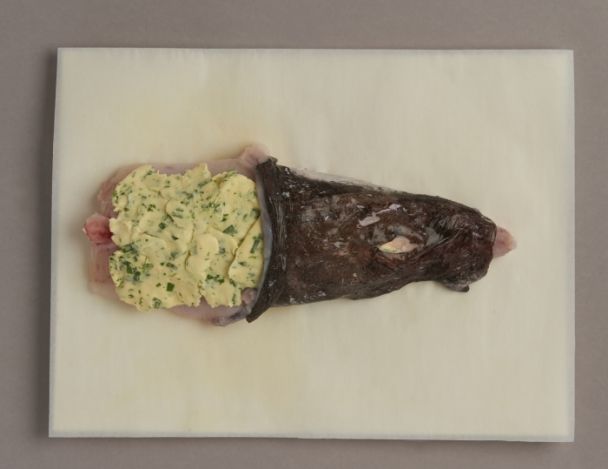 Etaler le beurre d'herbes sous la peau des poissons.