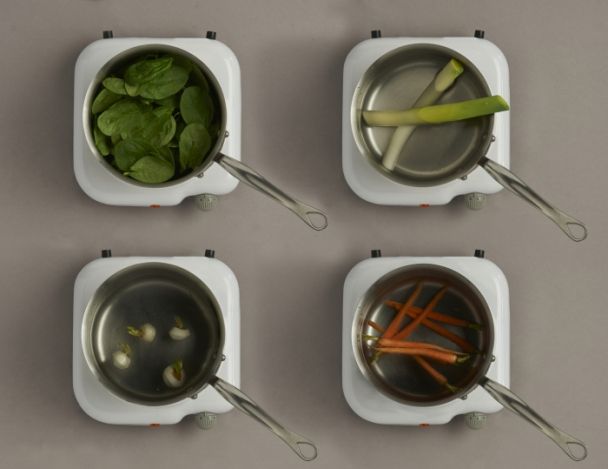 Les faire cuire séparément dans des casseroles d'eau salée avec une noisette de beurre. Faire tomber les épinards avec une noisette de beurre pendant 1 min dans une casserole. Réserver les légumes.