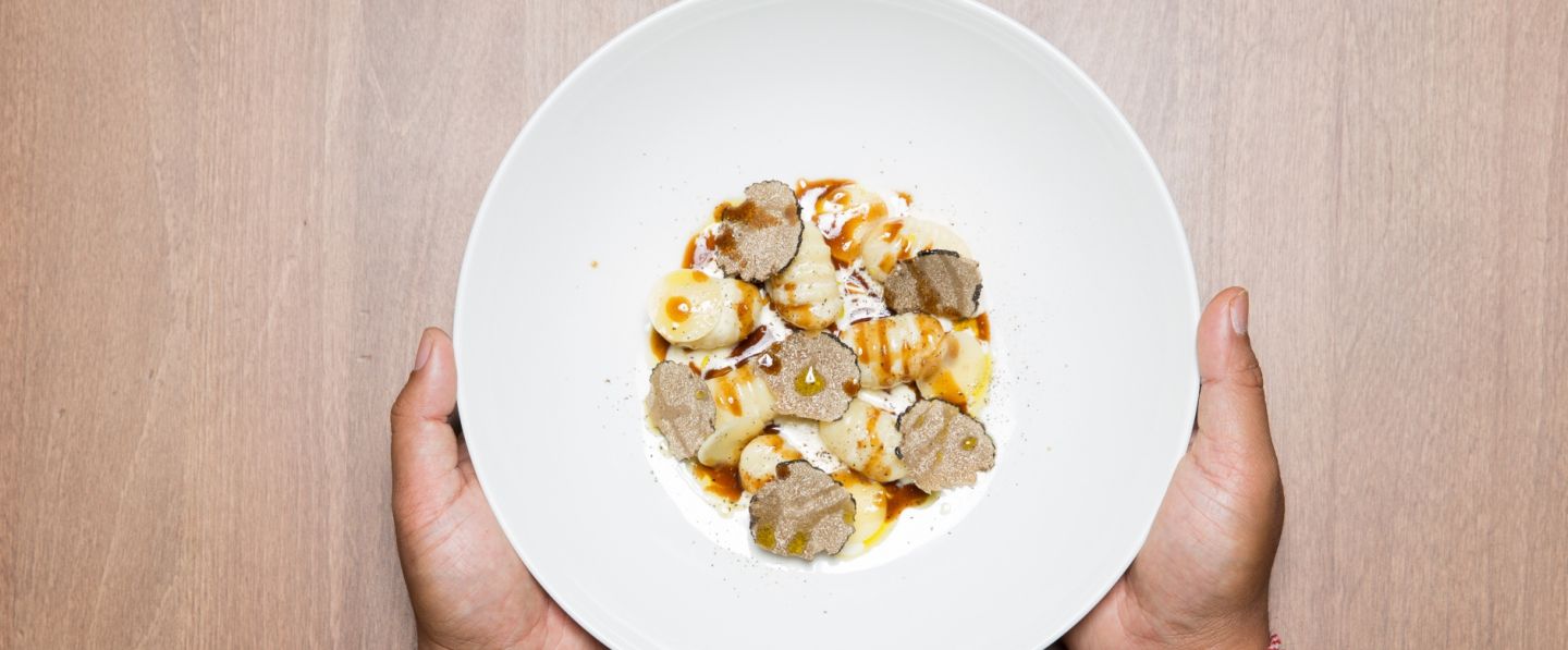 Faire réduire la crème liquide dans une casserole. Ajouter le beurre et l’huile de truffe noire, y ajouter les gnocchis afin de les enrober. Servir chaud. Dresser en râpant le comté et disposant la truffe noire sur les gnocchis.