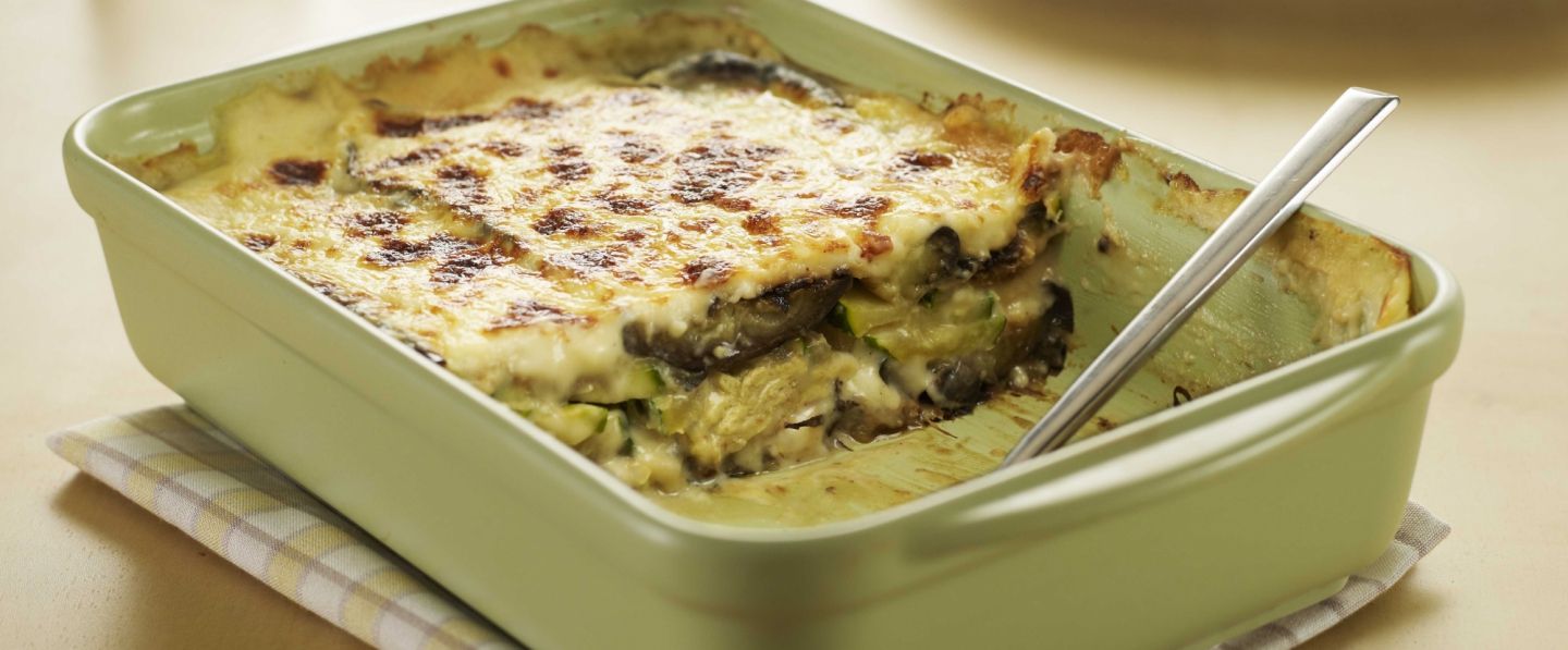 Beurrer un plat et rangez, bien serrées, la moitié des tranches d'aubergines grillées. Verser dessus la moitié de la béchamel puis les courgettes aux œufs.