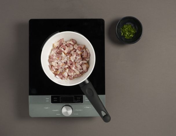 Faire suer les échalotes au beurre. Incorporer les lardons et les faire revenir. Incorporez la crème épaisse et la muscade.