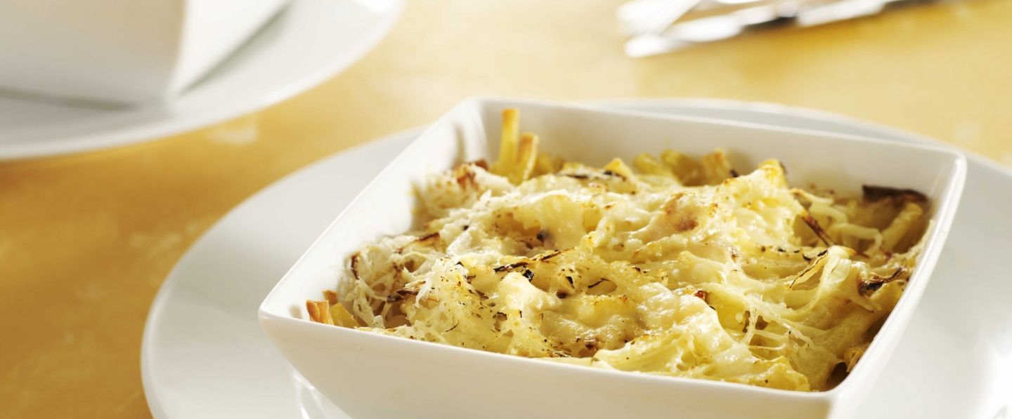 Dans un plat à gratin, disposer les macaronis, recouvrir de crème, d'oignon, et ajouter des copeaux de comté et le parmesan.
