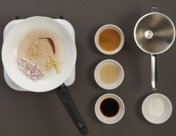 DifficileHacher l'ail, émincer le gingembre. Faire suer l'ail, le gingembre, les échalotes et le piment rouge.