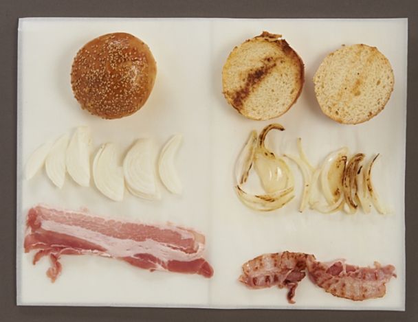 Toaster les pains à hamburgers au grill. Tailler en rondelles les oignons.