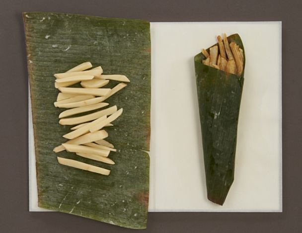 Former des cornets avec les feuilles de banane. Frire les frites et les déposer dans les cornets.