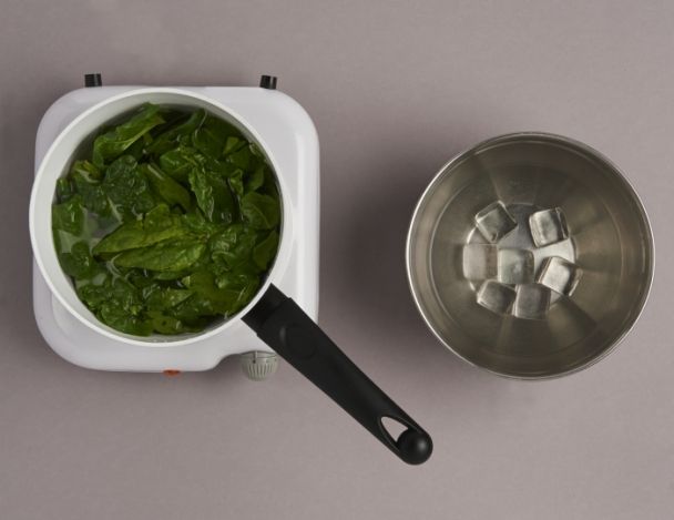 Blanchir les feuilles d’épinards 1 min dans de l’eau bouillante avec une poignée de gros sel, puis les refroidir dans de l’eau glacée.