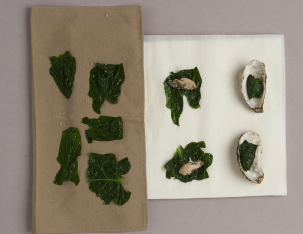 Disposer les feuilles d’épinards sur un linge sec pour les égoutter, puis emballer les huîtres dans les feuilles d’épinards et les déposer dans leur coquille.