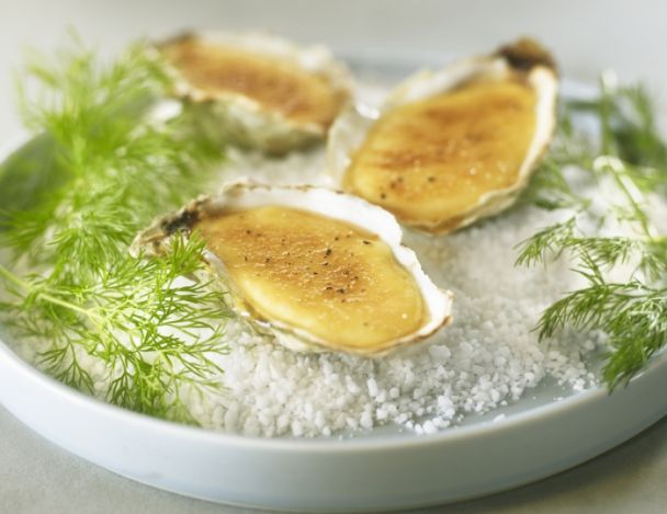 Napper les huîtres de sabayon et les faire gratiner au grill du four pendant environ 2 min en surveillant la cuisson afin que le sabayon ne noircisse pas. Servir bien chaud.