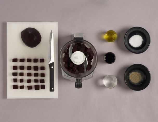 MoyenEplucher et couper en morceaux les betteraves. Mettre dans le bol du blender avec le vinaigre, l’huile d’olive, l’eau froide, le sel et le poivre. Mixer jusqu’à obtenir une émulsion très lisse et réserver au froid.