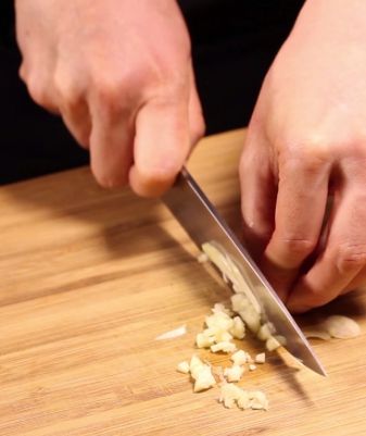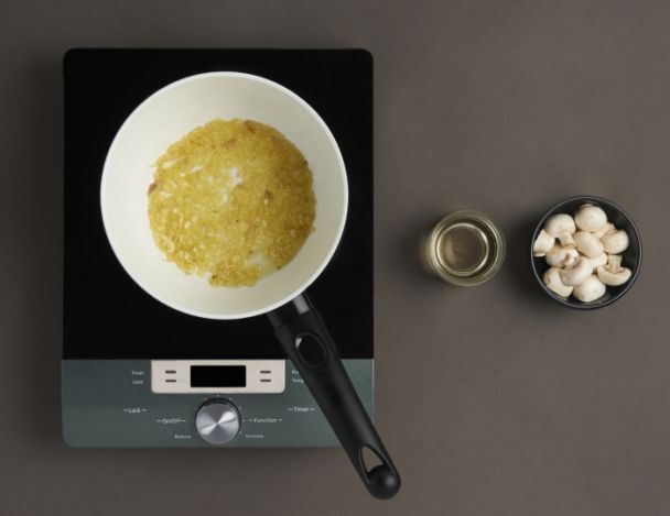 Hacher l'ail et l'échalote. Faire suer l'échalote et l'ail dans l'huile d'olive. Déglacer au vin blanc et ajouter les champignons. Cuire à couvert pendant 3 minutes. Laisser refroidir dans le jus.