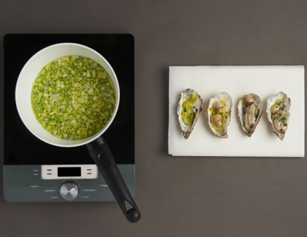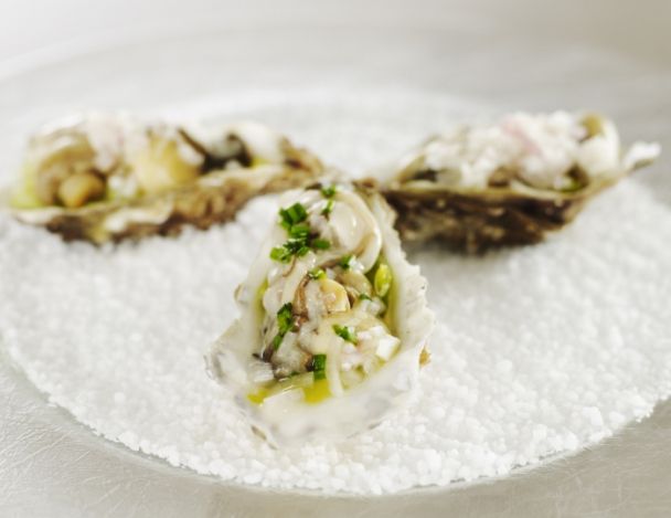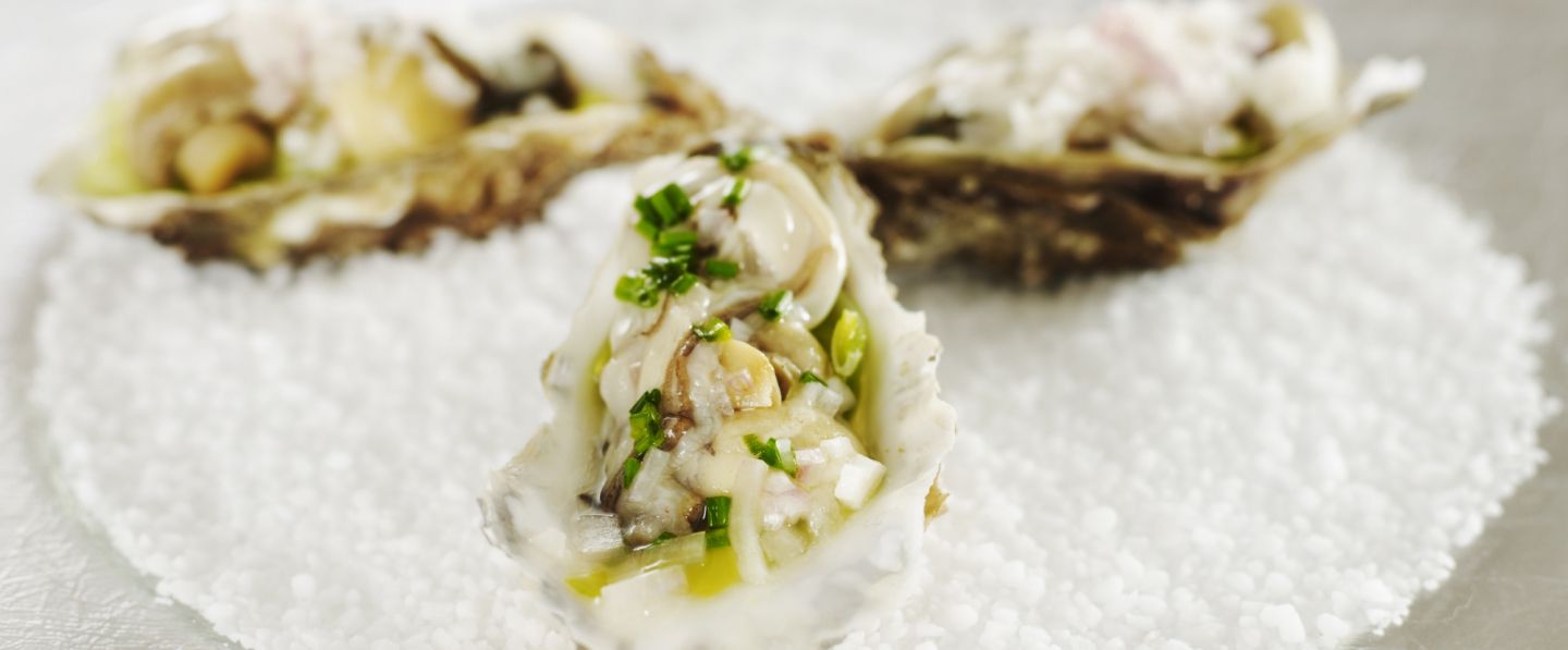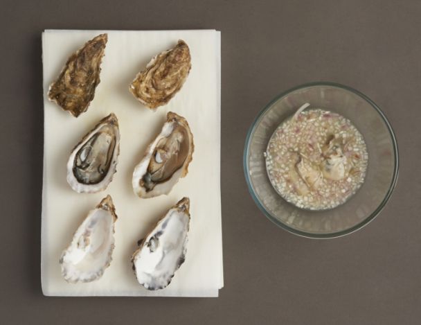 MoyenOuvrir les huîtres, les détacher de la coquille, réserver l'eau de mer et mariner les huîtres avec le citron. Rajouter l'huile d'olive et éventuellement détendre la marinade avec le restant d'eau des huîtres. Hacher très fin l'échalote, puis la mariner dans du citron.