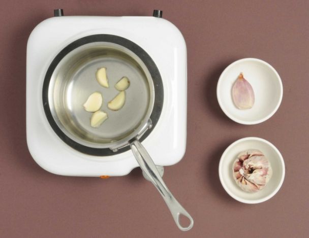Blanchir l’ail des ours pendant 2 min, retirer et réserver, puis faire cuire la tête d’ail et les échalotes dans la même eau bouillante pendant 15 min.