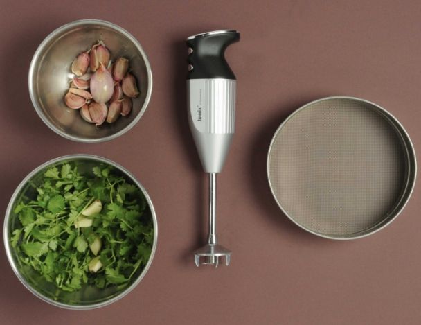 Faire de même avec l’ail et les échalotes, assembler les deux purées obtenues et les mixer avec 100 g de beurre.