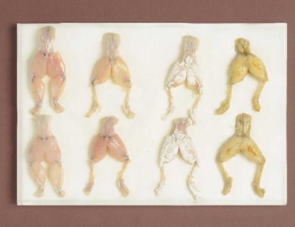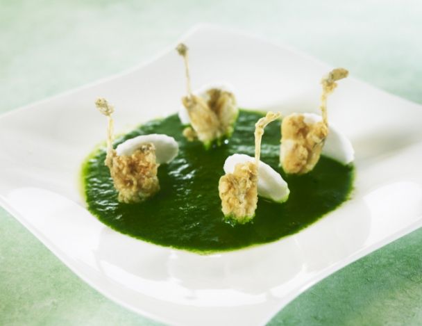 Étaler la purée à l’ail des ours au centre d’un emporte-pièce de 6 cm de diamètre posé dans une grande assiette, disposer harmonieusement six cuisses de grenouille et servir aussitôt.