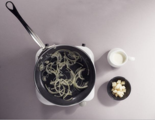 FacileEplucher et émincer les oignons. Les faire revenir dans un peu d'huile d'olive dans une casserole à feu doux.
