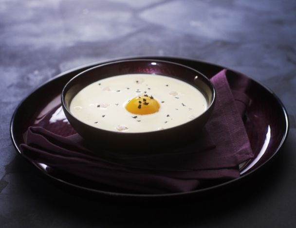 Napper de crème parmesan, (si vous avez un siphon vous pouvez la faire en mousse). Raper la truffe par-dessus, servir.