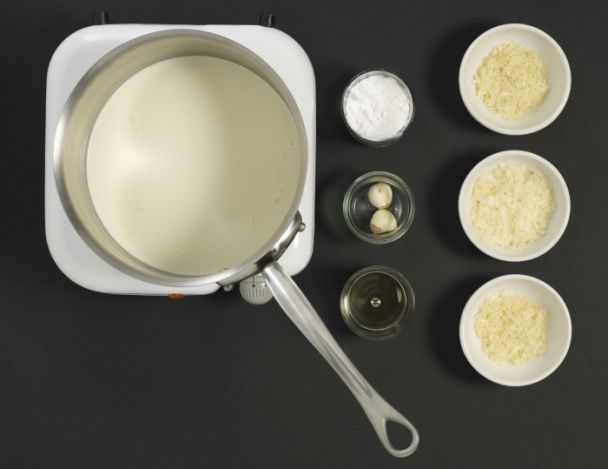 MoyenFaire bouillir ensemble la gousse d'ail, le vin blanc et la crème. Lier avec 20g de fécule de pomme de terre. Ajouter petit à petit le comté, le beaufort et l'emmental.