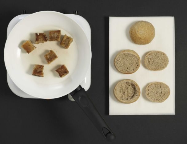 Poêler les cubes de mie de pain de campagne, au beurre.