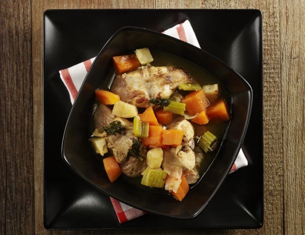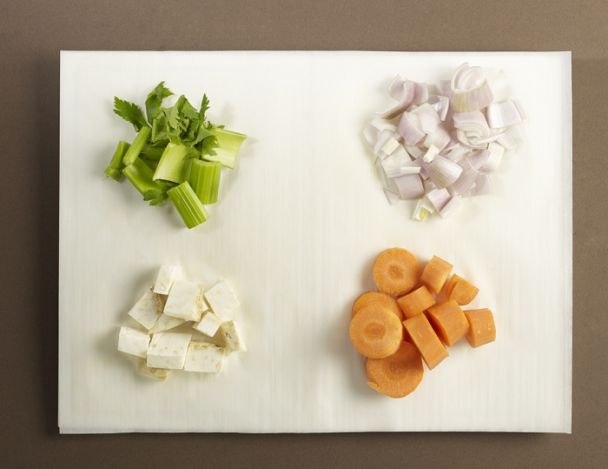 MoyenCouper en dés tous les légumes : céleri branche, céleri boule, carotte et échalote. Réserver.