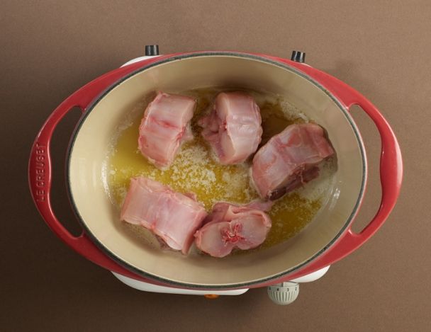 Dans une cocotte, faire revenir les morceaux de lapin saler et poivrer. Retirer les morceaux de la cocotte et réserver.