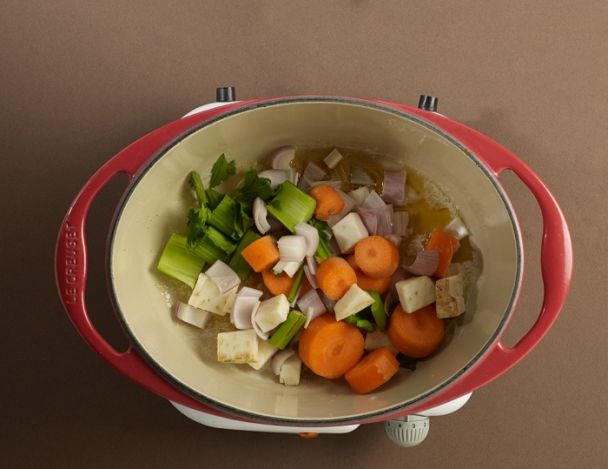 Mettre tous les légumes dans la cocotte et les faire suer pendant 15 minutes.