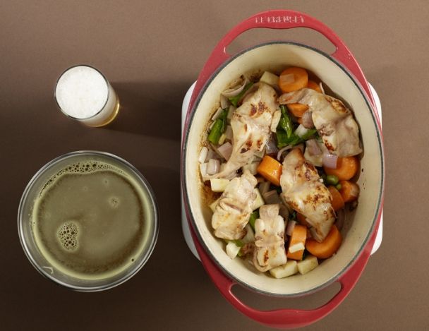 Remettre les morceaux de lapin sur les légumes. Mouiller avec la bière et le bouillon. Porter à ébullition et écumer. Cuire à l'étouffé doucement pendant 1h.