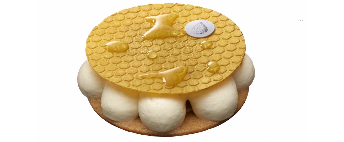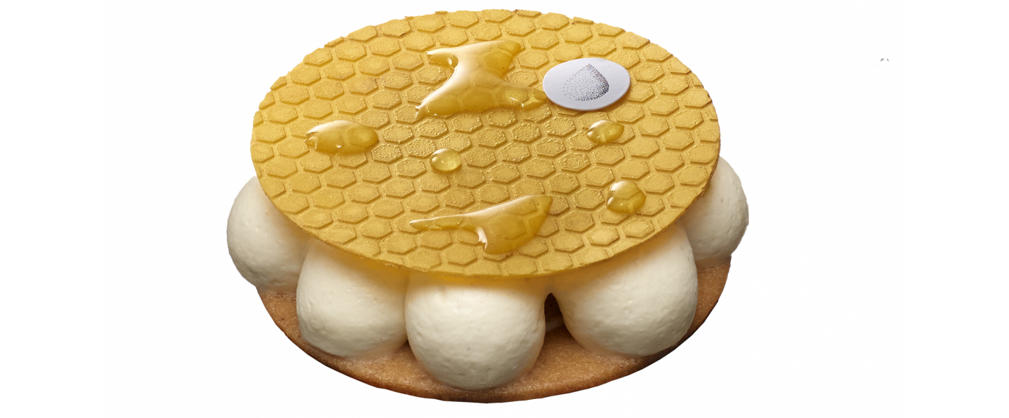 Finir avec un disque de chocolat imprimé « ruche » avec quelques gouttes de miel de mille fleurs.