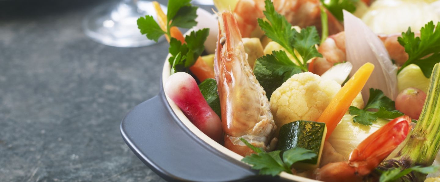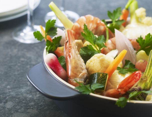 Intercaler les crevettes marinées. Napper les légumes de cette sauce et servir à la louche.