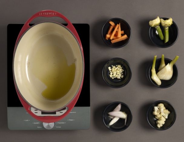 Faire chauffer 3 cuillerées à soupe d'huile d'olive dans une grande cocotte et faire revenir les carottes, l'ail, les échalotes, les artichauts, le fenouil, et le chou-fleur sans coloration.