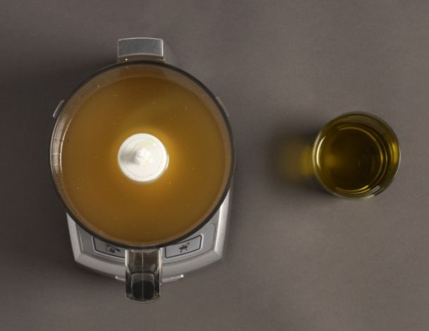 Dans un blender, émulsionner le jus froid avec de l'huile d'olive : mesurer le volume de jus et ajouter en huile d'olive la moitié de ce volume.