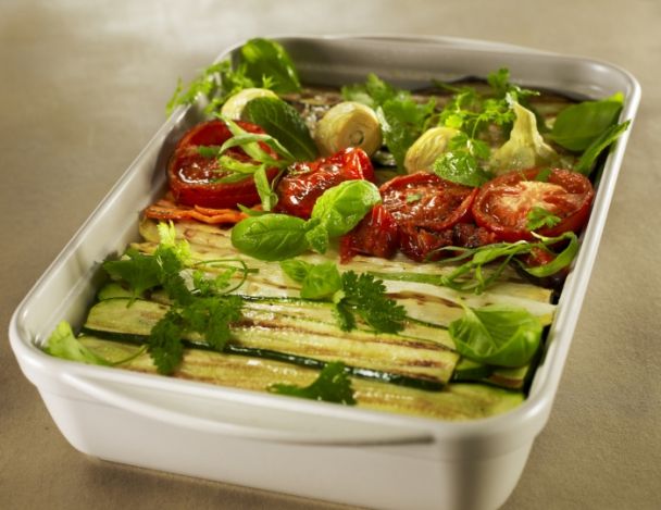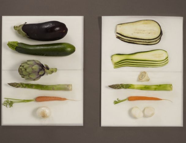 MoyenNettoyer et préparer tous les légumes. Tourner les artichauts en retirant les feuilles extérieures avec un couteau tranchant. Tailler en tranches l'aubergine et la courgette.