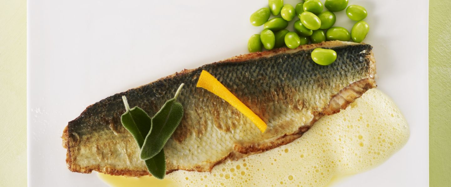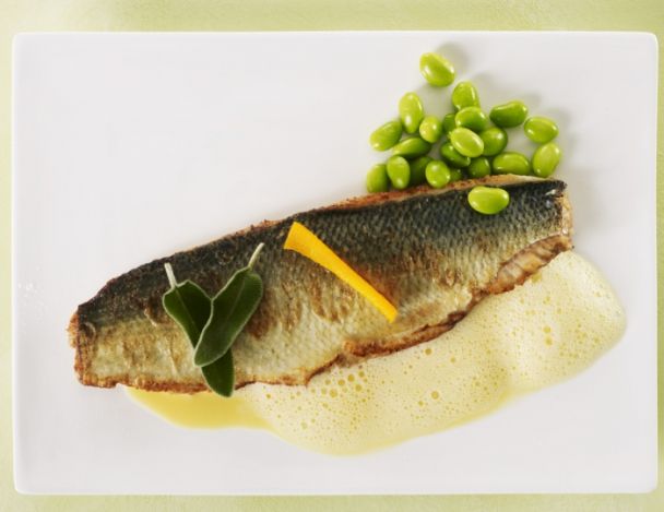 Poser le filet au milieu de l’assiette avec une branche de sauge sur le dessus, ainsi qu’une chips d’orange. Faire une généreuse quenelle de fèves. Emulsionnez la sauce et disposez 2 louches (en prenant la mousse et le liquide) dans l’assiette. Ajoutez du gros sel sur le poisson.