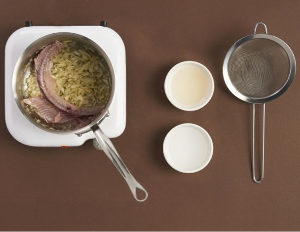 Faire le fumet avec les arrêtes de loup, pour cela suer les oignons et les arêtes, déglacer le tout au vin blanc et avec de l'eau puis laisser frémir pendant 25 minutes. Passer au chinois.