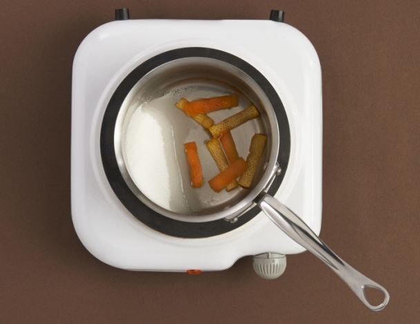 Enlever la peau des 2 oranges avec un couteau économe. Former des rectangles avec les zestes, en prenant soin d’enlever les zestes. Mettre à bouillir le sucre et l’eau dans une casserole, et confire les zestes pendant 30 minutes. Egoutter les peaux d’oranges, puis les dresser entre 2 plaques en fonte pour les enfourner à 135°C, pendant environ 25 minutes.