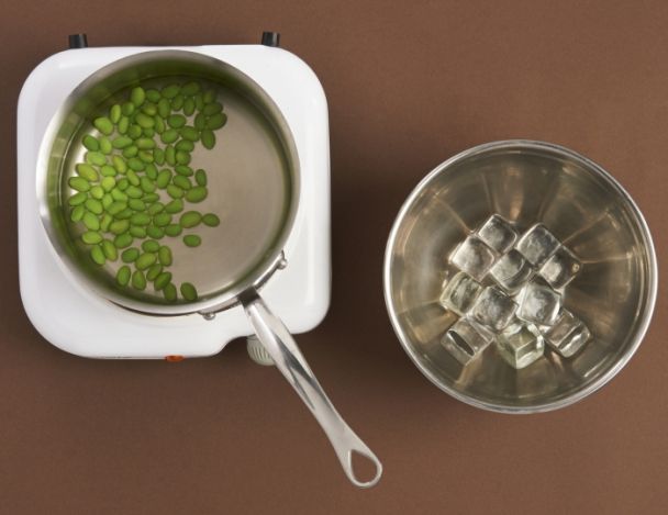 Ecosser les fèves et les faire cuire dans de l’eau bouillante salée. Refroidir celles-ci dès la fin de la cuisson dans de l’eau glacée. Garder au chaud avec un peu de beurre dans une casserole.