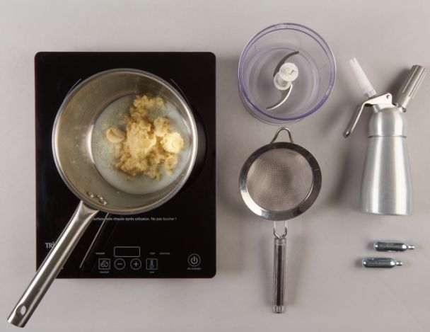 Mettre la pulpe de pommes de terre dans une casserole. Verser le lait et ajouter les gousses d’ail cuites. Mixer le tout et passer au chinois. Verser dans un siphon et injecter deux cartouches de gaz pour chantilly. Réserver au chaud.