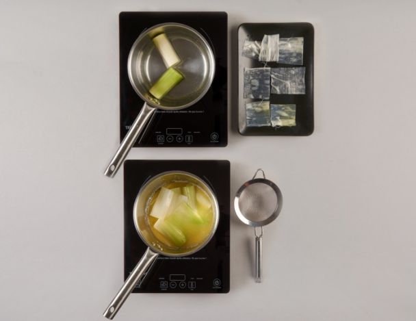 Couper des tronçons de 9 cm et blanchir à l’eau bouillante salée. Garder les poireaux al dente, effeuiller une fois cuit.