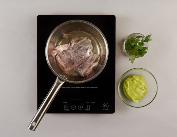Retirer la peau du cabillaud et le réserver au frais. Dans une casserole, chauffer l’huile d’olive à 60°C. et ajouter la peau coupée en petits morceaux. Mixer et laisser cuire.