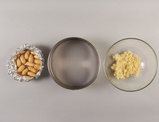 Cuire les pommes de terre en papillote au four à 180 degrés. Une fois cuites, passer les pommes de terre au tamis.