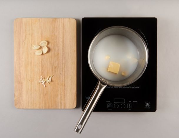Éplucher l’ail, le dégermer et le blanchir dans de l’eau puis cuire dans le lait et 200 gr de beurre.