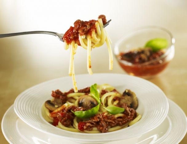 Faire revenir la viande hachée dans de l'huile d'olive jusqu'à ce qu'elle prenne couleur. Ajouter la chair de tomates et un trait de ketchup. Ajouter les champignons revenus. Laisser cuire pendant 15 à 20 minutes. Ajouter, 5 minutes avant la fin, la gousse d'ail restante, écrasée et les herbes.