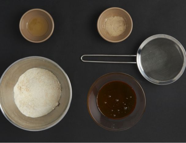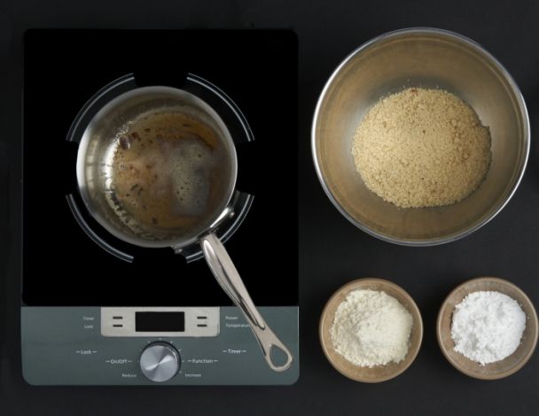 Cuire le beurre façon noisette et le laisser refroidir. Tamiser la farine et le sucre glace. Sortir les œufs du réfrigérateur pour qu'ils soient à température ambiante. Dans un saladier, mélanger la poudre d’amande et le précédent mélange (farine+sucre).