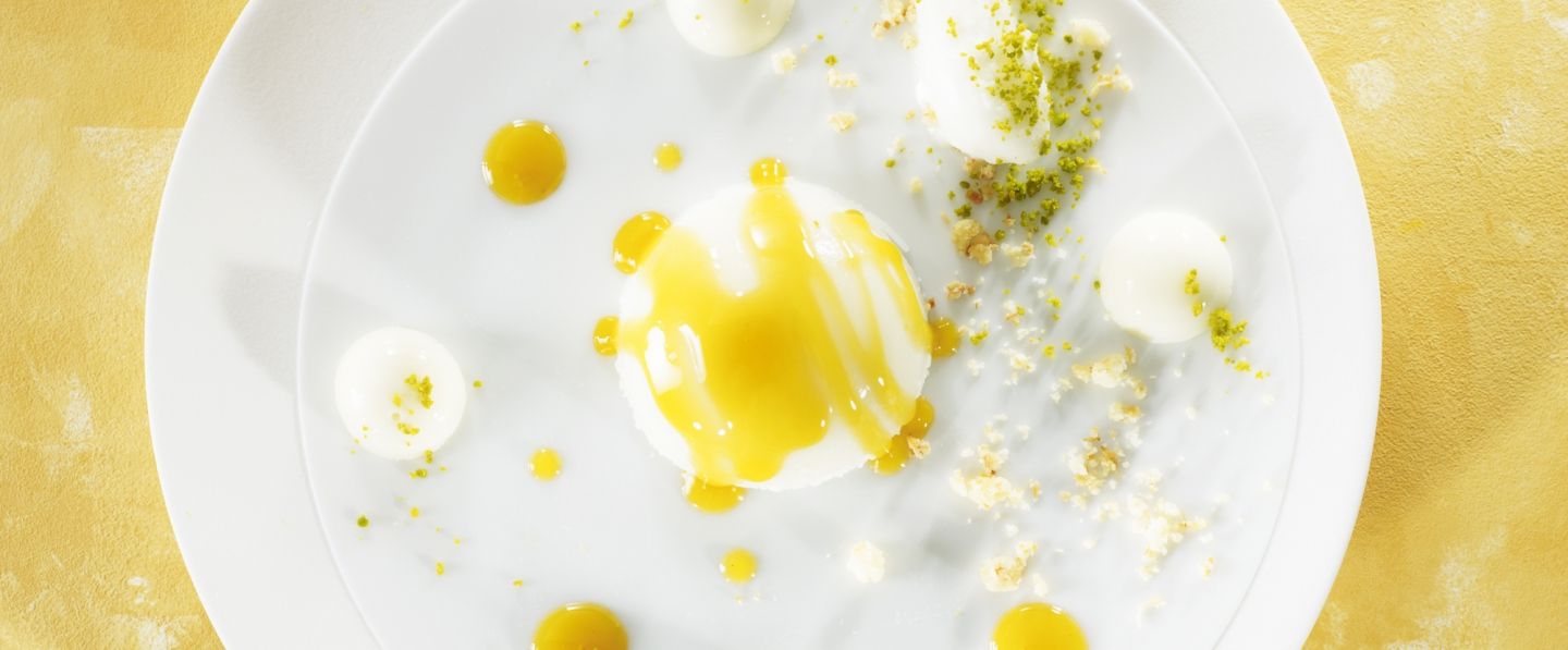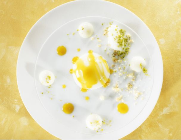 Disposer des boules de blanc-manger coco tout autour. Ajouter une quenelle de sorbet citron vert. Parsemer de poudre de citron vert.