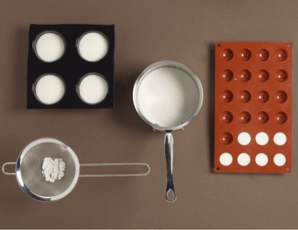 Couler une partie de la préparation en la filtrant sur une plaque ou un plateau pour obtenir une gelée de quelques millimètres. Verser le reste de la préparation non filtrée, dans un moule en silicone pour obtenir de petites boules de blanc-manger.