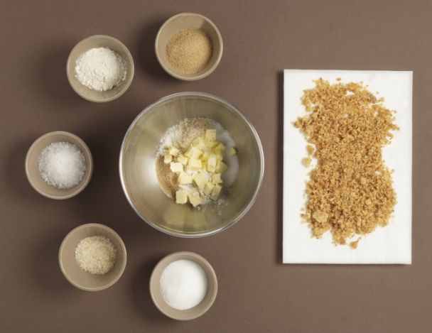 Faire torréfier la noix de coco. Mélanger tous les ingrédients secs puis incorporez le beurre en morceaux pour obtenir une pâte comme un crumble.