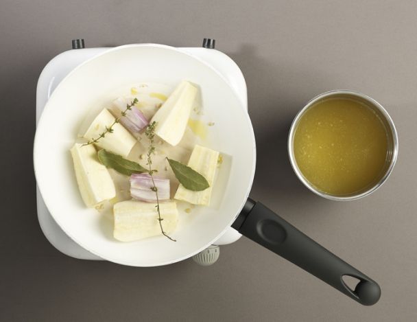 Pendant ce temps, rôtir les panais coupés en 6 avec l'ail, le thym, le laurier et les échalotes coupées en 2, pendant 5 minutes à feu doux. Ajouter le litre de bouillon et laisser cuire 30 minutes.