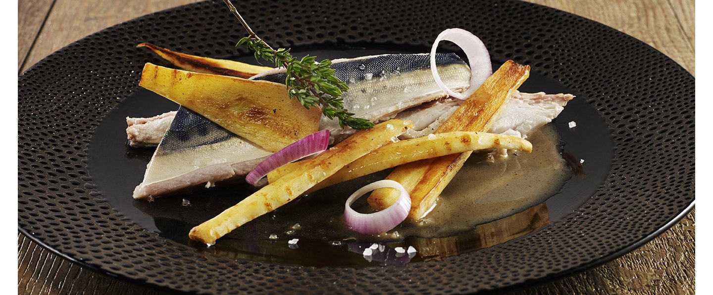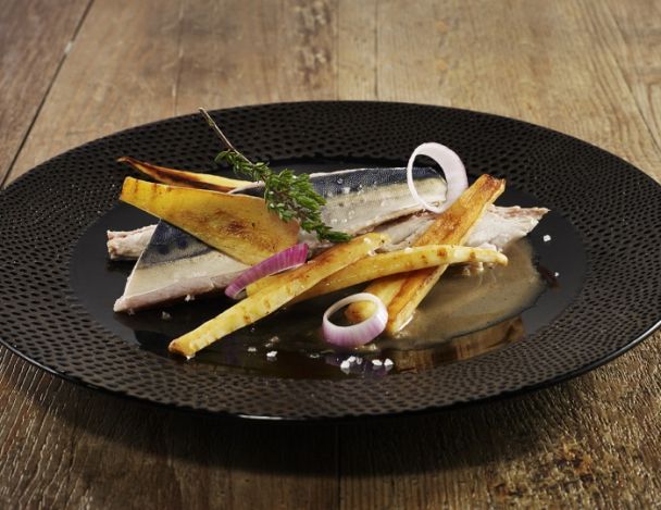 Prendre les filets et les disposer dans un plat. Ranger les panais confis au dessus et à côté. Mettre le reste de bouillon à hauteur et enfourner à 100°C pendant 20 minutes.
