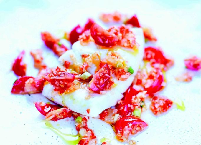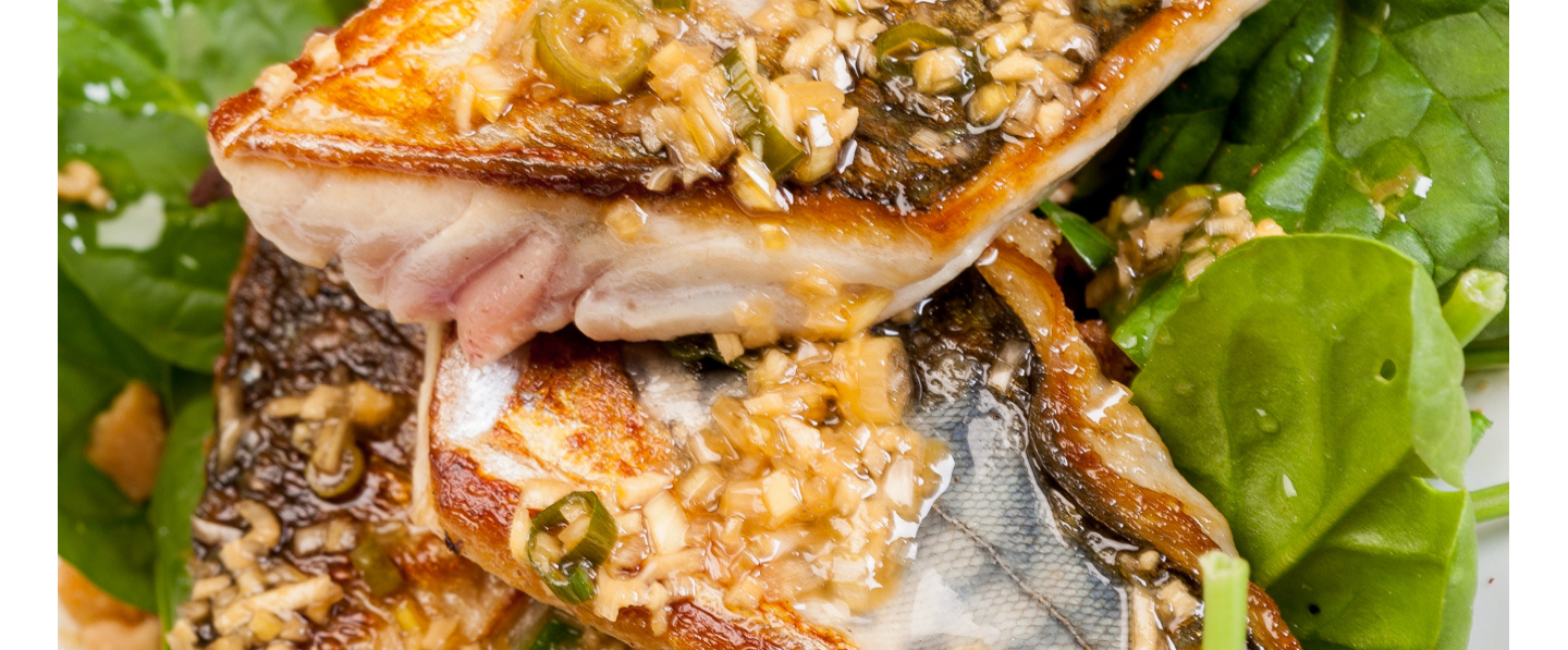 Verser la sauce pimentée sur les filets de maquereaux et sur les pousses d’épinards.